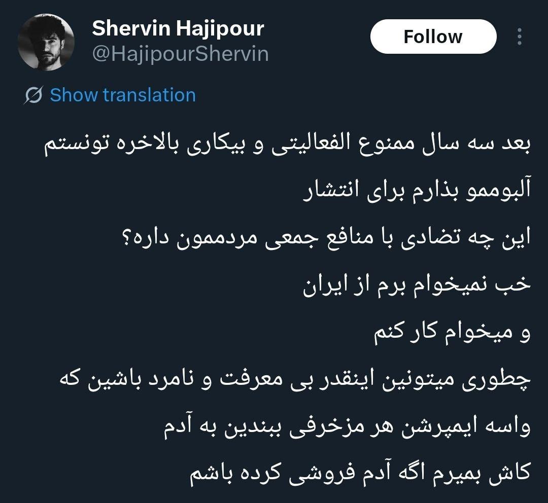در واکنش به این انتقادها، شروین حاجیپور با انتشار یک توییت توضیح داد که بعد از سه سال ممنوعالفعالیتی و بیکاری، توانسته مجوز انتشار آلبومش را بگیرد و این موضوع را مغایر با منافع جمعی نمیداند. او تأکید کرد قصد ترک ایران را ندارد و میخواهد به فعالیت هنریاش ادامه دهد. حاجیپور همچنین در پایان نوشت که «آدمفروشی نکرده» و انتقادها از او بیانصافانه است.