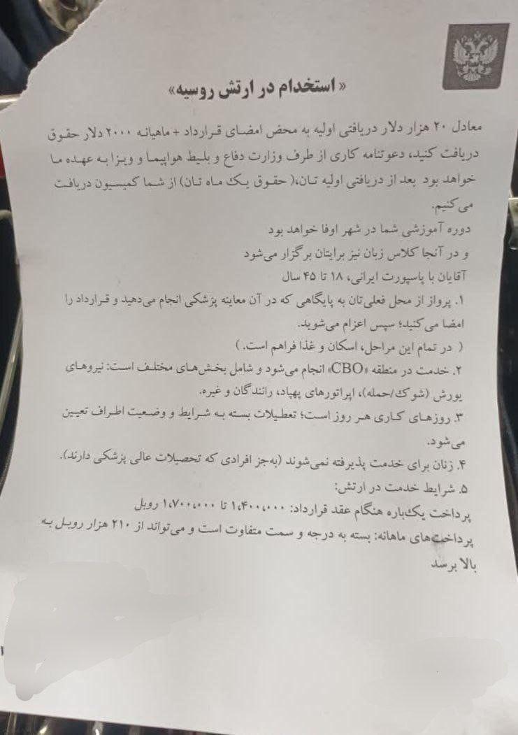 🔹 اخیرا دیده شده که نهادهای وابسته به سفارت روسیه در تهران، با وعدههای مالی سرابگونه، شهروندان ایرانی را برای جنگ اوکراین جذب میکنند. این عملیات که زیر پوشش "برنامه رسمی استخدام اتباع خارجی" صورت میگیرد در حقیقت قاچاق سرباز به خط مقدم جنگی است که روسیه در آن با بحران شدید نیروی انسانی مواجه شده.