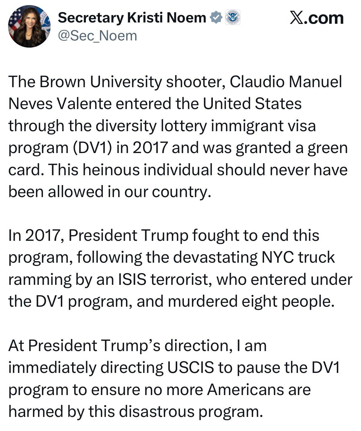 خبرنامه گویا - وزیر امنیت داخلی آمریکا، کریستی نوم، به دستور دونالد ترامپ، تعلیق برنامه قرعهکشی گرینکارت را اعلام کرد. او گفت این برنامه به مظنون تیراندازیهای دانشگاههای "براون" و "اِم آی تی" اجازه ورود به آمریکا را داده بود.