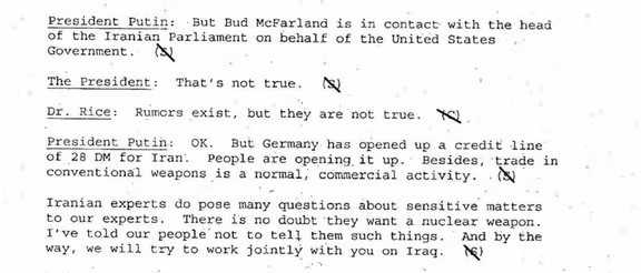 در یکی از مهمترین این اسناد، مربوط به دیدار ۱۶ ژوئن ۲۰۰۱ در اسلوونی، پوتین خطاب به بوش میگوید: «کارشناسان ایرانی پرسشهای زیادی درباره مسائل حساس از کارشناسان ما میپرسند. تردیدی نیست که آنها خواهان سلاح هستهای هستند. به افرادمان گفتهام چنین اطلاعاتی را در اختیارشان نگذارند.» این جمله، صریحترین ارزیابی ثبتشده از نگاه رهبر کرملین به نیت هستهای جمهوری اسلامی در اوایل دهه ۲۰۰۰ به شمار میرود.