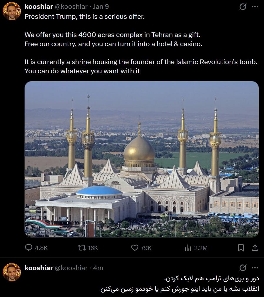 پیام طنز یک کارآفرین ایرانی-آمریکایی حوزهٔ هوش مصنوعی (کوشیارعظیمیان) به ترامپ در شبکهٔ ایکس؛ پیشنهاد تبدیل زمین ۴۹۰۰ هکتاری آرامگاه خمینی در تهران به کازینو!