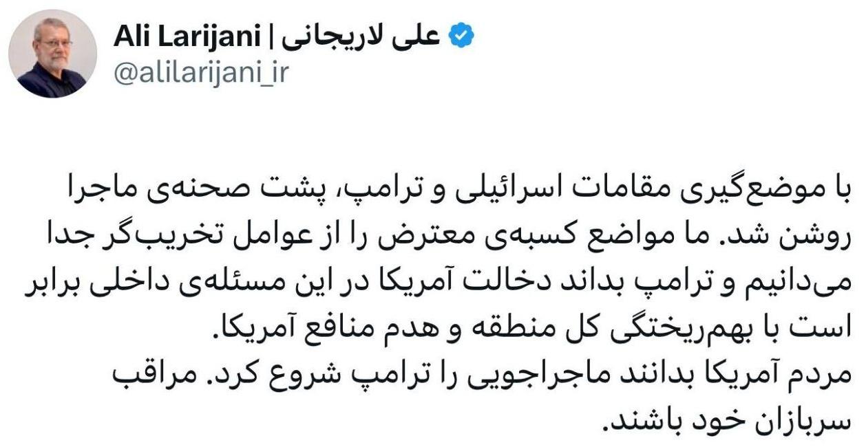 علی لاریجانی به مردم آمریکا: مراقب سربازان خود باشید