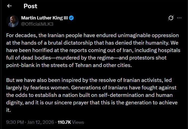 مارتین لوتر کینگ سوم: برای دههها، مردم ایران تحت ظلم غیرقابل تصور یک دیکتاتوری بیرحم قرار داشتهاند که انسانیت آنها را انکار کرده است.