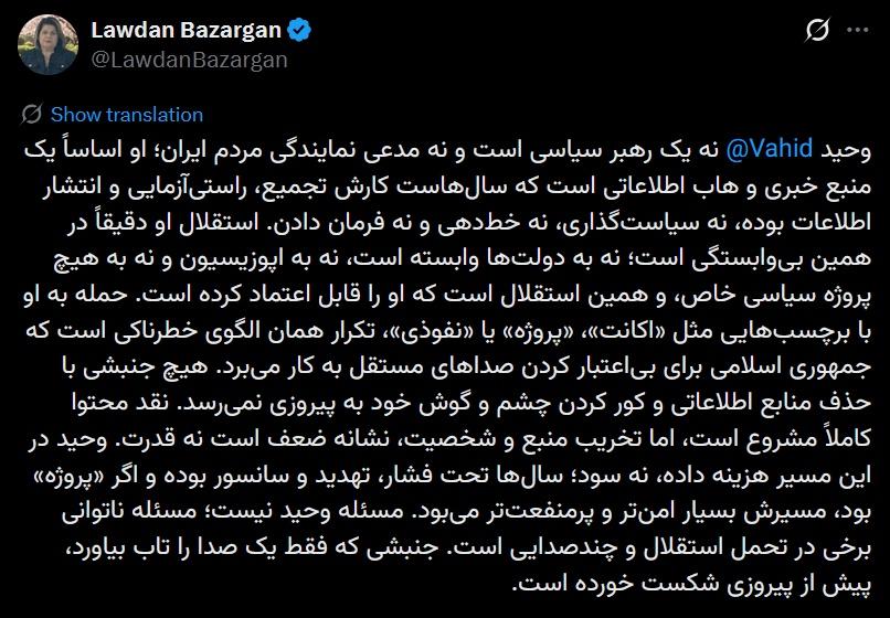 این حملات را باید در چارچوب الگوی آشنای جمهوری اسلامی برای بیاعتبارسازی صداهای مستقل تحلیل کرد. همانگونه که لادن بازرگان، فعال سیاسی، تأکید کرده است، وحید آنلاین نه رهبر سیاسی است، نه مدعی نمایندگی مردم ایران و نه وابسته به پروژهای خاص؛ او اساساً یک منبع خبری و هاب اطلاعاتی است که سالهاست کارش تجمیع، راستیآزمایی و انتشار اطلاعات بوده است. استقلال او دقیقاً در همین بیوابستگی معنا پیدا میکند؛ استقلالی که نه به دولتها وابسته است، نه به اپوزیسیون و نه به هیچ جریان سیاسی، و همین ویژگی او را به منبعی قابل اعتماد برای طیف گستردهای از مخاطبان تبدیل کرده است.
