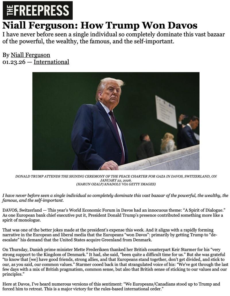 ایندیپندنت فارسی - دونالد ترامپ، رئیسجمهوری آمریکا مقالهای از فریپرس با عنوان «ترامپ چطور در داووس پیروز شد» را در «تروث سوشال» بازنشر کرد که در آن به دلیل تمرکز بر موضوع گرینلند به جای ایران نیز پرداخته شده است.
