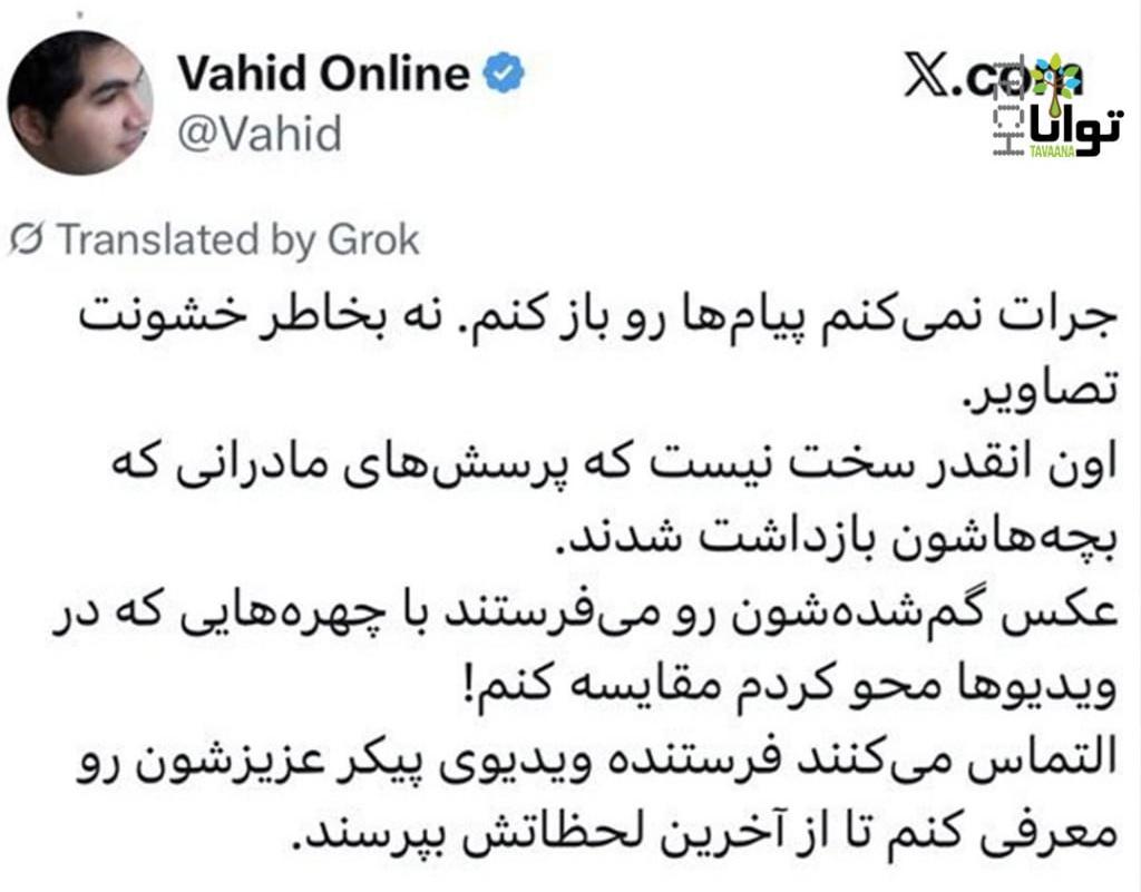 وحید آنلاین، فعال رسانهای و خبری، با انتشار توییتی در شبکه ایکس به واقعیتی تلخ و هولناک اشاره میکند: مادران و خانوادههایی که میان انبوه هزاران عکس و ویدئو از قربانیان اعتراضات، یا به دنبال نشانی از عزیزان ناپدیدشده خود میگردند، یا در جستوجوی تلخ آخرین کلماتی هستند که پیش از مرگ از زبان فرزندانشان گفته شده است.