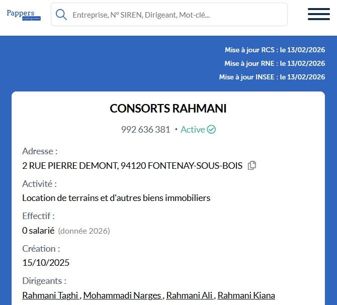 خبرنامه گویا - اسناد رسمی منتشر شده در سامانه ثبت شرکتهای دولت فرانسه نشان میدهد که شرکتی با نام "CONSORTS RAHMANI" (کنسورت رحمانی) به صورت رسمی در حومه پاریس به ثبت رسیده است. این شرکت که از نوع شرکت مدنی املاک است، مستقیماً با نام تقی رحمانی، فعال سیاسی مقیم فرانسه، و نرگس محمدی، برنده جایزه صلح نوبل که در حال حاضر در ایران زندانی است، پیوند خورده است.