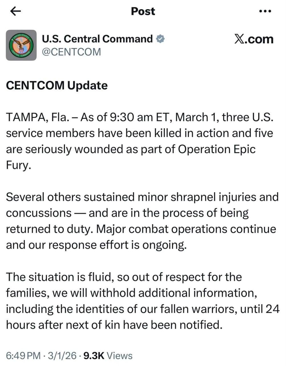 ستاد فرماندهی مرکزی ارتش آمریکا، «سنتکام» روز یکشنبه دهم اسفند در بیانیهای اعلام کرد: «تا ساعت ۹:۳۰ صبح به وقت شرق آمریکا، سه نفر از نیروهای آمریکایی در جریان عملیات «خشم حماسی» کشته و پنج نفر دیگر به شدت زخمی شدهاند.» بنا بر این بیانیه چندین نفر دیگر نیز دچار جراحات ناشی از اصابت ترکش و ضربه مغزی شدهاند و در حال بازگشت به محل خدمت خود هستند.