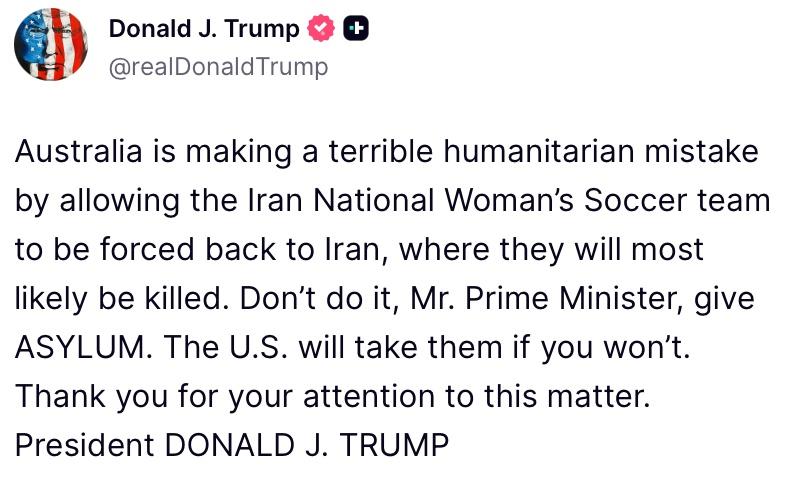 دونالد ترامپ وادار کردن تیم ملی فوتبال زنان ایران به بازگشت به ایران را «اشتباه انسانی وحشتناک» خواند و گفت این افراد در آنجا «به احتمال زیاد کشته خواهند شد». او خطاب به نخستوزیر استرالیا نوشت: «به آنها پناهندگی بدهید. اگر شما این کار را نکنید، آمریکا آنها را خواهد پذیرفت.»