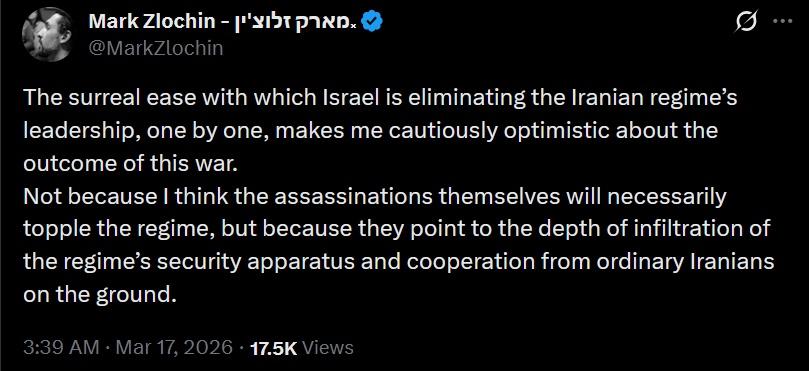 سهولتی که اسرائیل با آن، یکییکی رهبران جمهوری اسلامی را از میان برمیدارد، صحنهای بهقدری غیرعادی و باورنکردنی است که با احتیاط نسبت به نتیجه این جنگ امیدوارم میکند.