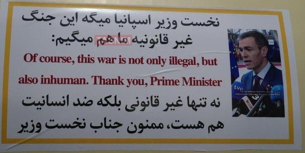 ویدئویی که رسانههای حکومتی جمهوری اسلامی بهعنوان تصاویر «موج هفتاد و پنجم» حملات موشکی منتشر کردهاند، نشان میدهد روی بدنه برخی موشکها تصویر و نقلقولی از پدرو سانچس، نخستوزیر چپگرای اسپانیا، نصب شده؛ جملهای که در آن سانچس حملات به جمهوری اسلامی را «غیرقانونی و غیرانسانی» توصیف میکند، در کنار آن عبارت «ممنون از شما آقای نخستوزیر» دیده میشود