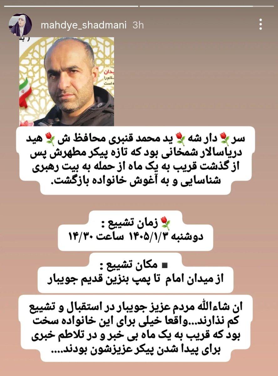 مهدیه شادمانی، دختر علی شادمانی، فرمانده کشتهشده قرارگاه مرکزی خاتمالانبیا در جریان جنگ ۱۲ روزه، در استوری اینستاگرام خبر داد که جنازه محمد قنبری، از محافظان علی شمخانی، دبیر شورای عالی دفاع جمهوری اسلامی، پس از یکماه شناسایی شده است.
