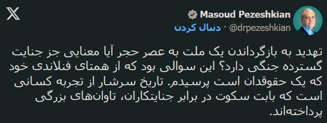 خبرنامه گویا - آقای پزشکیان، شما تهدید دونالد ترامپ را «اعتراف به قصد ارتکاب جنایت گسترده جنگی» مینامید و از مسئولیت تاریخی در برابر چنین تهدیدهایی سخن میگویید. اما پرسش اینجاست: اگر تهدید به نابودی یک ملت مصداق «جنایت گسترده جنگی» است، پس آنچه حتی در همین ماههای اخیر در داخل کشور رخ داده را چه باید نامید؟ گزارشها از سرکوبهای خونین، که در آن تنها در دو روز تلفات میان ۸ هزار تا +۳۰ هزار شهروند گزارش شده، آیا خارج از همان تعریفی است که شما امروز برای محکومکردن تهدید دونالد ترامپ به کار میبرید؟