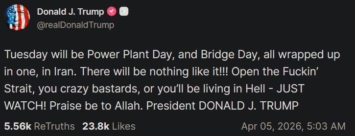 ترامپ در شبکه اجتماعی خود، تروث سوشال، با تکرار تهدید حمله به زیرساختها نوشت: «سهشنبه روز نیروگاه و پل در ایران خواهد بود.»