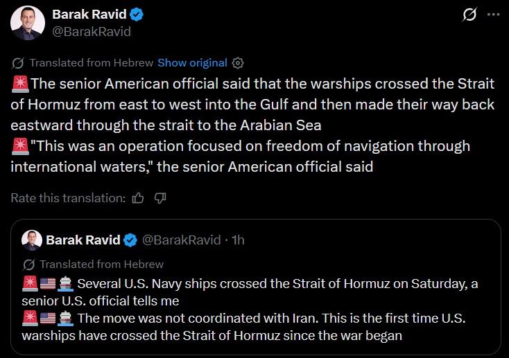 خبرنامه گویا - به گفته باراک راوید خبرنگاراکسیوس در ساعات اخیر چند ناو نیروی دریایی آمریکا (روز شنبه) از تنگه هرمز عبور کرده اند؛ اقدامی که به گفته مقامهای آمریکایی برای نخستینبار از زمان آغاز جنگ انجام شده و بدون هماهنگی با جمهوری اسلامی بوده است.