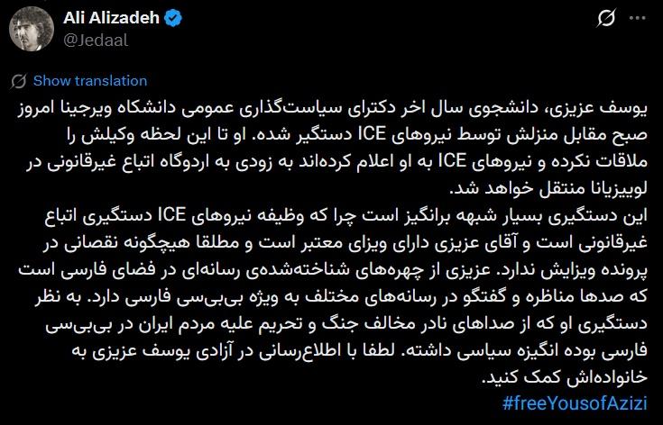 بر اساس گزارشهای منتشرشده، عزیزی که دارای وضعیت اقامتی معتبر بوده، صبح امروز مقابل منزل خود توسط نیروهای ICE بازداشت شده است. گفته میشود او هنوز موفق به ملاقات با وکیل خود نشده و احتمال انتقالش به بازداشتگاهی در ایالت لوییزیانا مطرح شده است. تا این لحظه، هیچ تأیید رسمی درباره این خبر منتشر نشده است.
