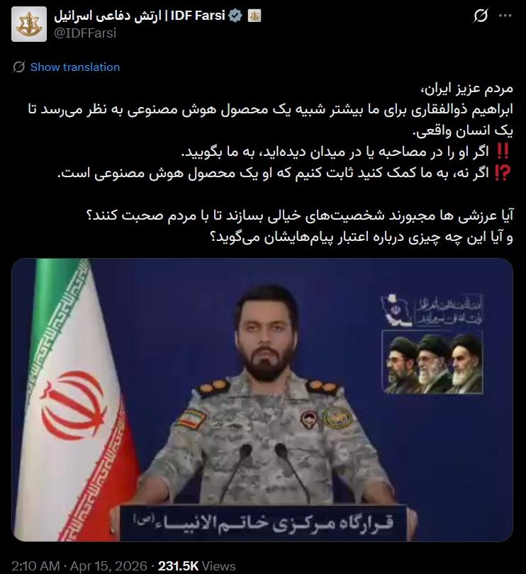 ارتش اسرائیل مردم ایران را به چالش کشید: «این فرد واقعی است؟