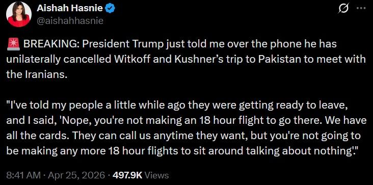 «دونالد ترامپ، رئیسجمهور آمریکا، در تماس تلفنی به من گفت که بهطور یکجانبه سفر استیو ویتکاف و جرد کوشنر به پاکستان برای دیدار با ایرانیها را لغو کرده است.»