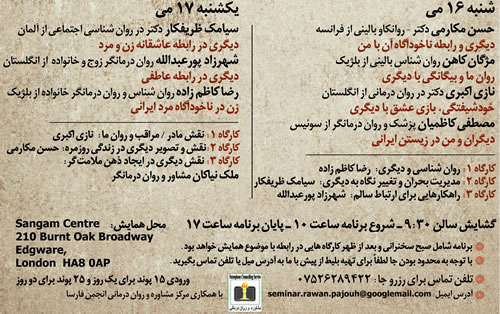 » 'دارندگان گرین کارت هم مشمول ممنوعیت سفر به آمریکا میشوند' » فرهادی بزودی تصمیماش را برای حضور در مراسم اسکار اعلام میکند » گیتار و آواز گلشیفته فراهانی همراه با رقص بهروز وثوقی » چگونگی انفجار ساختمان پلاسکو را بهتر بشناسیم » گزارشهایی از "دیپورت" مسافران ایرانی در فرودگاههای آمریکا پس از دستور ترامپ » مشاور رفسنجانی: عکس هاشمی را دستکاری کردهاند » تصویری: مانکن های پلاسکو! » تصویری: سرمای 35 درجه زیر صفر در مسکو! لندن: "دیگری و روان ما"، چهارمین همایش روان پژوهان ایرانی خارج از کشور، ۱۶ و ۱۷ ماه مهچهارمین همایش روان پژوهان ایرانی خارج از کشور در لندن عنوان : دیگری و روان ما در این همایش تلاش می کنیم هموطنان را با کارکردهای روان، آسیب های روانی، پیشگیری و درمان آشنا کنیم تا بلکه از این راه زندگی مناسب ترى در مهاجرت و تبعید سپری کنند. حاصل کار ما تا کنون برگزاری سه همایش در شهر کلن (آلمان) با عناوین "مهاجرت و روان ما"، "فرهنگ و روان ما" و "خشونت و روان ما" بوده است. خرسندیم به اطلاع عموم برسانیم که چهارمین همایش روان پژوهان ایرانی خارج از کشور با عنوان "دیگری و روان ما" در شهر لندن و با همکاری مرکز مشاوره و رواندرمانی انجمن فارسا برگزار خواهد شد.